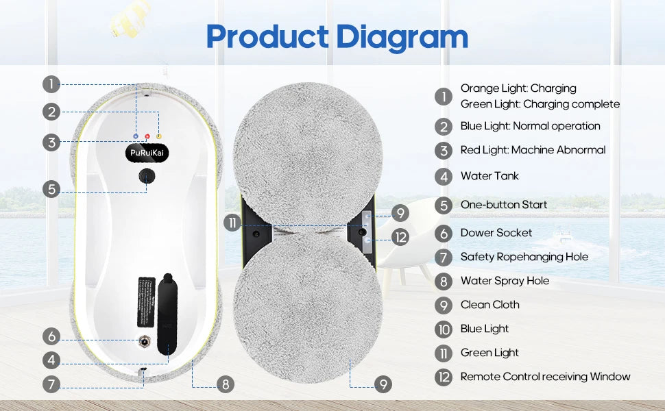 1. Wait 20 seconds after starting up until the blue light stop flashing,Then start working. Because the robot need 20sec to detect the glass plane.
