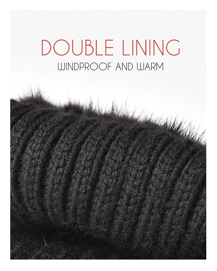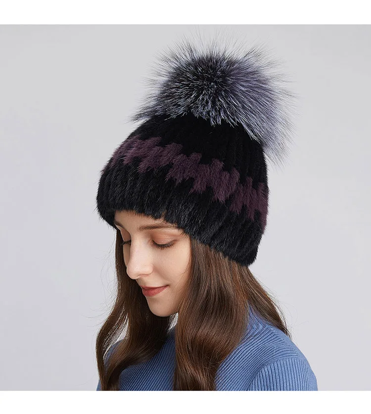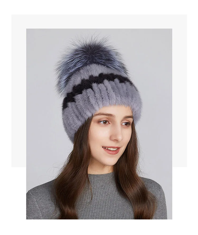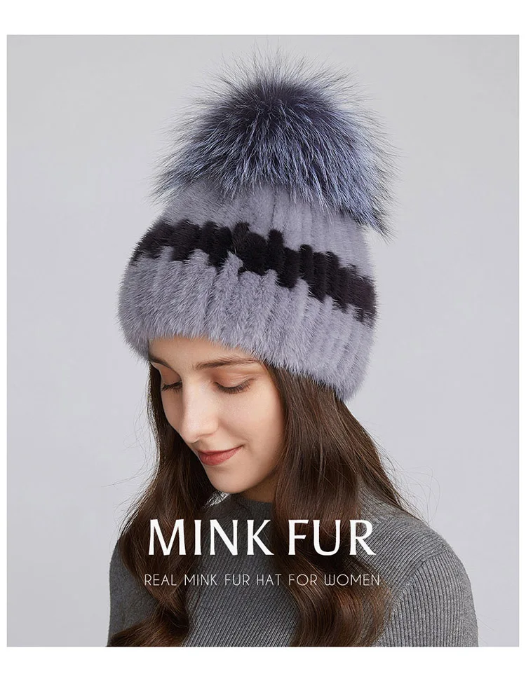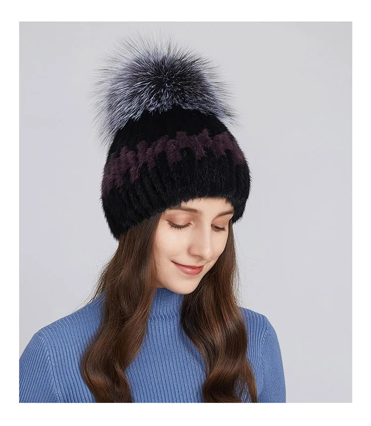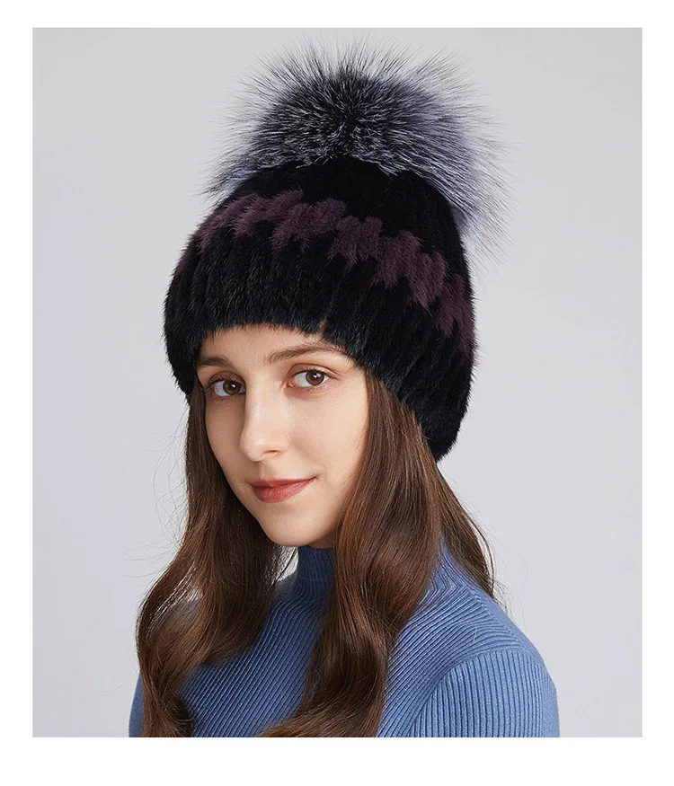 Wholesale Women Real Mink Fur Hats for Winter Knit Lined Hats With Silver Fox Fur Pom Poms Warm Knitted Beanies Cap Fur Ski Hat
