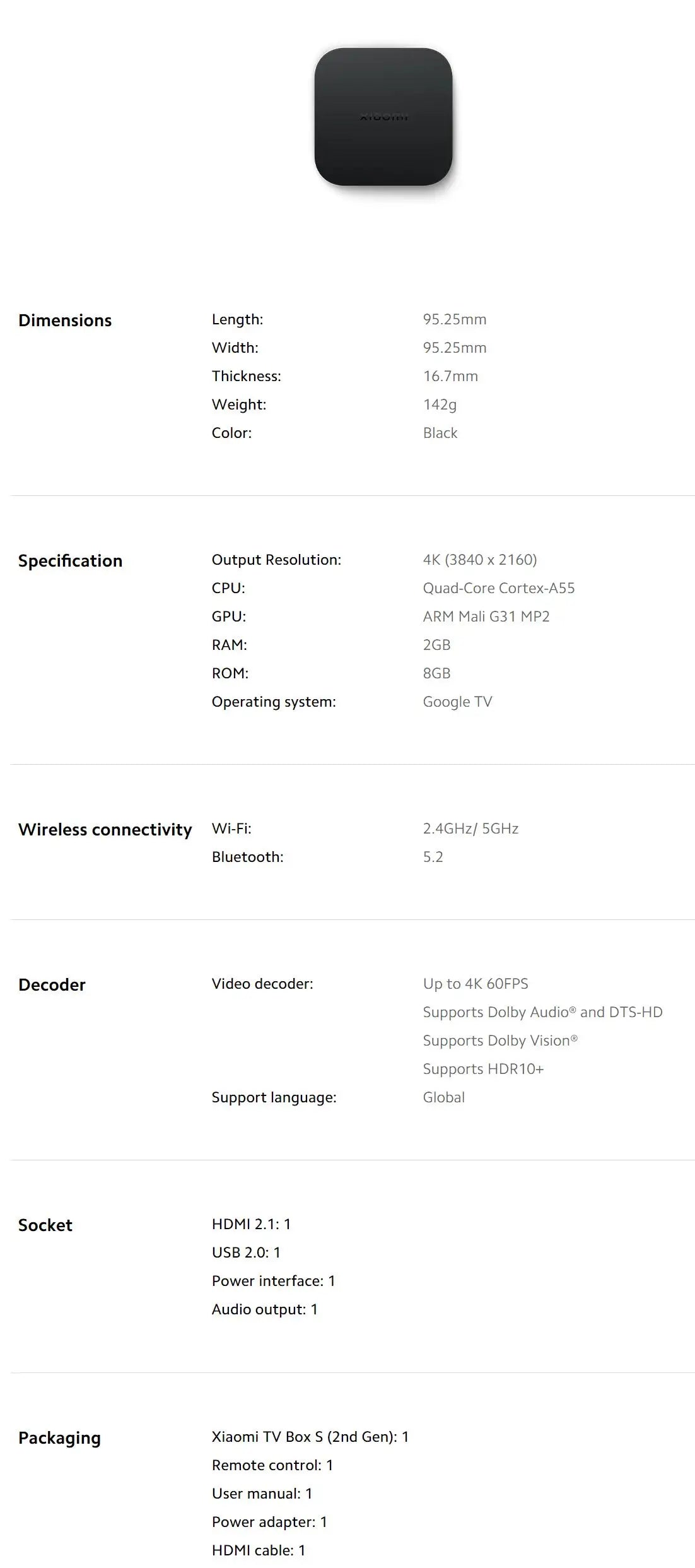 Xiaomi TV Box S 2nd Gen Product parameters: