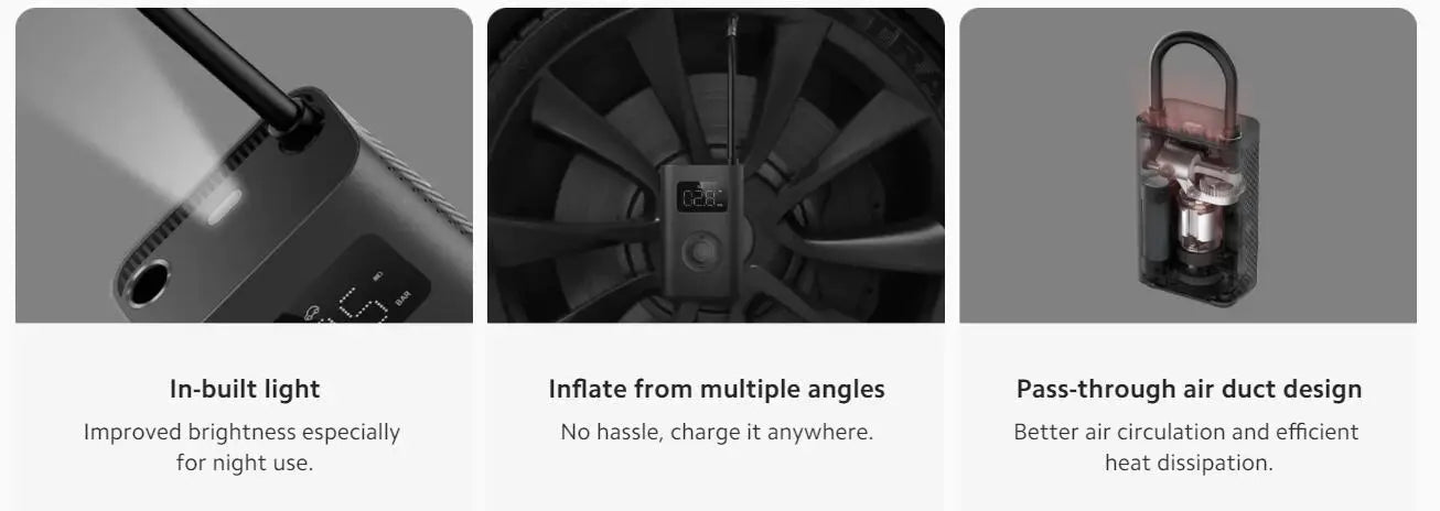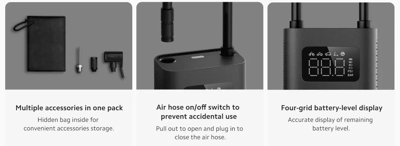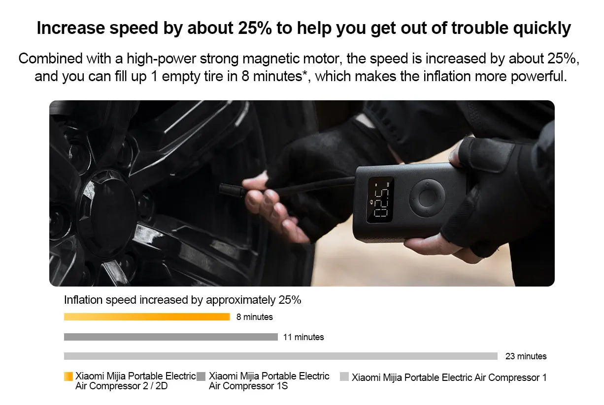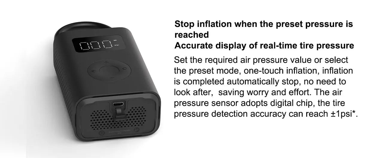 *Mi Portable Electric Air Compressor is accurate to ±2psi in tire pressure detection; the accuracy of Xiaomi Mijia Portable Electric Air Compressor 2 has been upgraded to ±1psi.